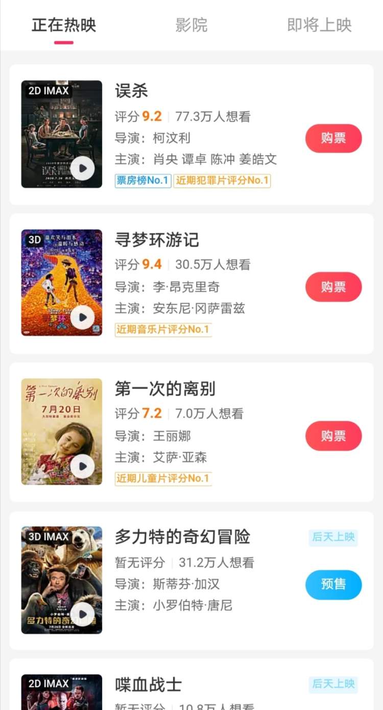 各影院排片以《误杀》、《寻梦环游记》、《战狼2》等上映过的经典影片为主,也有在上海首映的新片《第一次的离别》。其中,除上影百丽宫城排片较少外,其余三家影院均有约十部、二十余场的排片量。