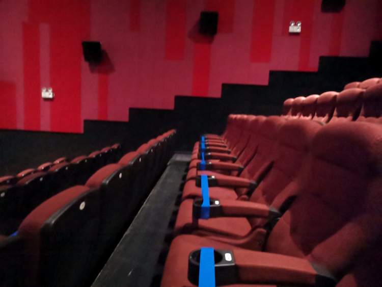 进入观影厅,与网络购票时被锁定的座位相对应,一部分座位也被贴上了胶带封条。