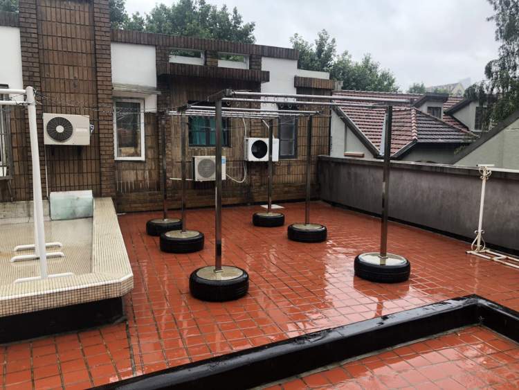 走到露台,原先的水泥地被一块块漂亮的红缸砖代替,吸水又防滑。由于露台上不能安装固定晾衣架,所有的晾衣架都用装了水泥的轮胎来加固。“露台下面本身是汽车间,这样倒也是满配的。” 柏祖芳如此介绍。