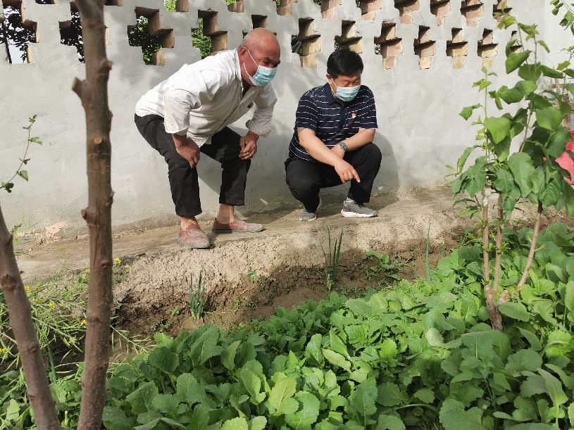 于鹏飞在农户家中查看房前屋后蔬菜长势