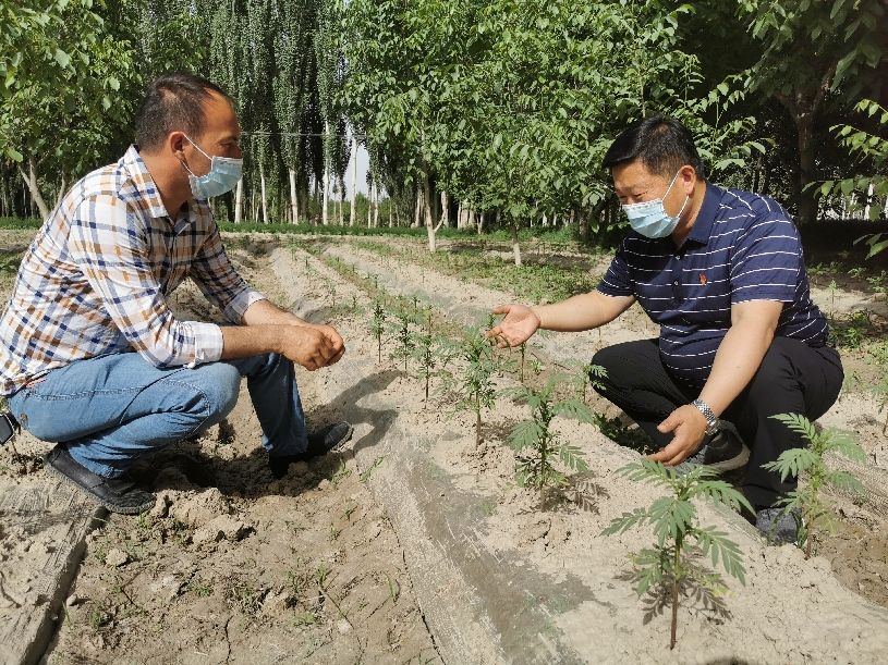 于鹏飞和村委会主任讨论特色种植作物的种植要求