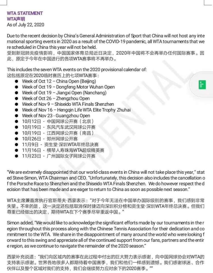 北京时间周四中午,网上流传一份疑似WTA的声明,显示今年WTA中国赛季已经被取消,这些赛事包括包括中网、武网、深圳总决赛等。