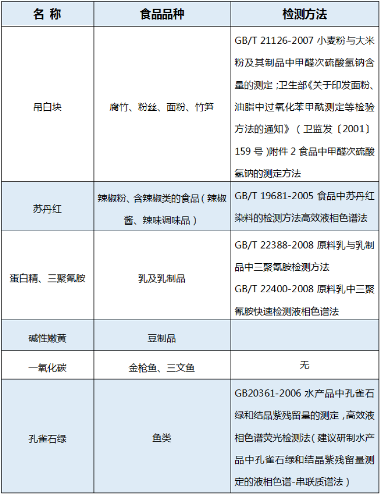 下面罗列几种生活中常见的食品中可能违法添加的非食用物质及可能滥用的食品添加剂,大家一定要擦亮眼睛看清楚哦!