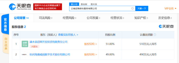 天眼查股东信息显示,该公司共有两大股东,第一大股东为建水县迎晖开发投资有限责任公司,持股比例51%;第二大股东为A股上市公司杭州海康威视数字技术股份有限公司,持股比例为49%。