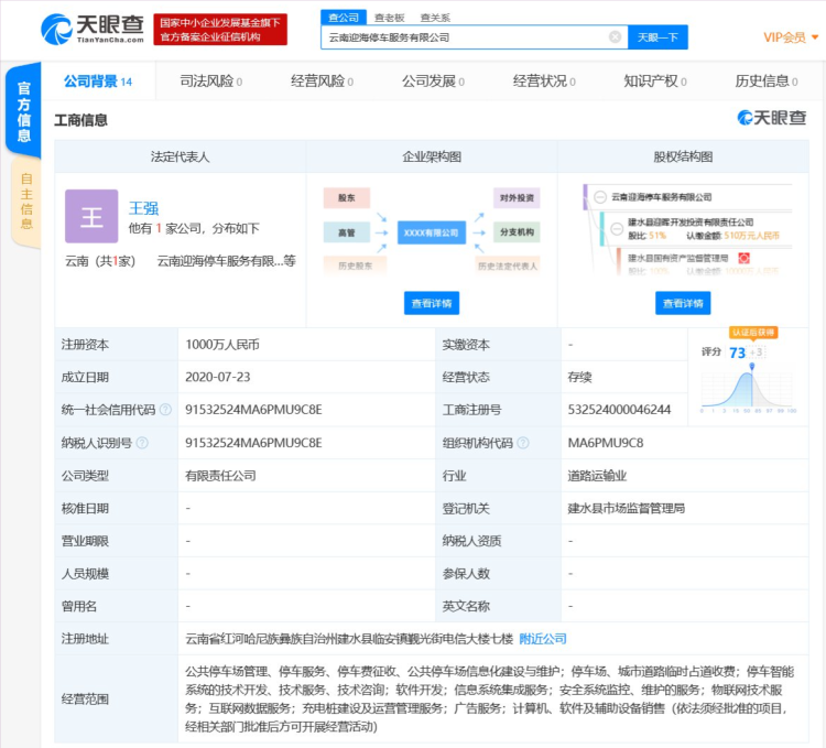 天眼查数据显示,7月23日,云南迎海停车服务有限公司成立,注册资本1000万元人民币,法定代表人为王强,公司经营范围包括公共停车场管理、停车服务、停车费征收、公共停车场信息化建设与维护等。