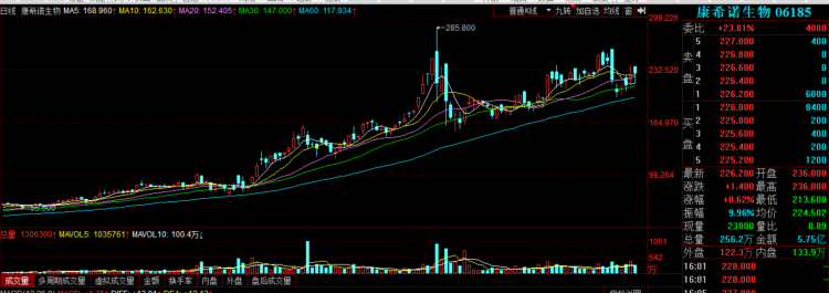 7月23日,康希诺生物-B收报226.2港元,市值504亿港元。不论从募资规模还是从港股价格来看,康希诺将是A股又一只高价新股,其科创板上市令人关注。