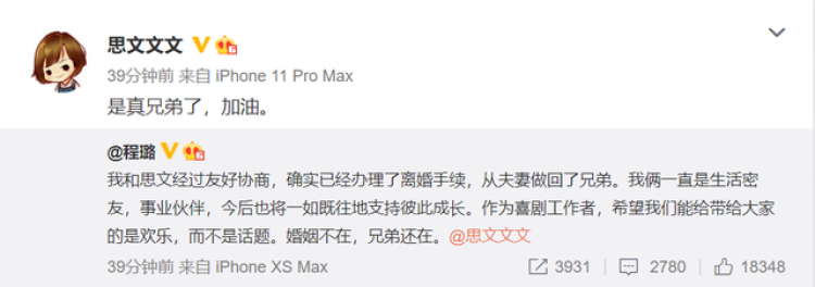 刚刚,程璐发布微博承认离婚消息,“我和思文经过友好协商,确实已经办理了离婚手续,从夫妻做回了兄弟。我俩一直是生活密友,事业伙伴,今后也将一如既往地支持彼此成长。作为喜剧工作者,希望我们能给带给大家的是欢乐,而不是话题。婚姻不在,兄弟还在。”随后,思文也转发表示“是真兄弟了,加油”。
