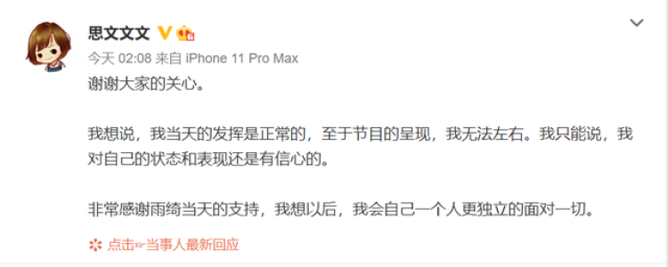 今天凌晨,在首期节目中被淘汰的思文率先发文,“谢谢大家的关心。我想说,我当天的发挥是正常的,至于节目的呈现,我无法左右。我只能说,我对自己的状态和表现还是有信心的。”她特别提到,感谢嘉宾张雨绮的支持,“我想以后,我会自己一个人更独立的面对一切。”