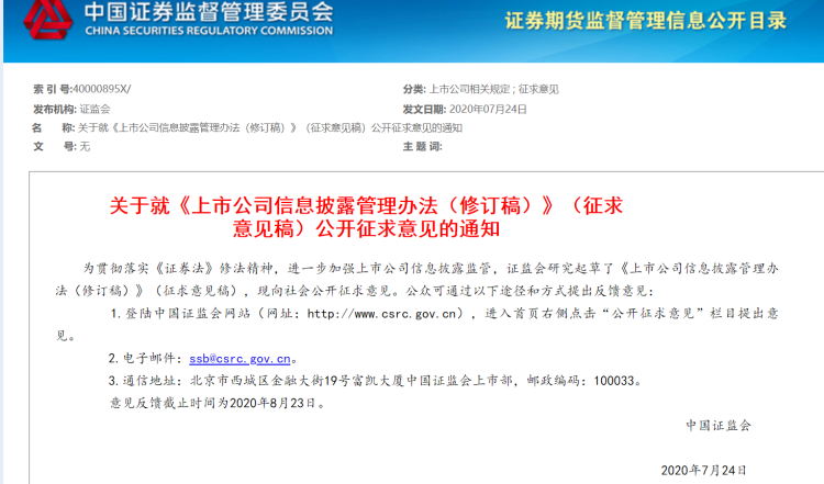 为落实2020年3月1日起施行的新《证券法》,持续加强信息披露监管,7月24日证监会就《上市公司信息披露管理办法(修订稿)》对外公开征求意见至2020年8月23日。