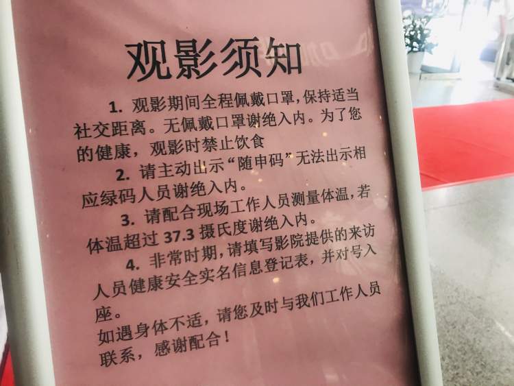 工作人员身边还立着一个告示牌,上面写明了观影须知。须知明确规定,观影时禁止饮食,需全程佩戴口罩。