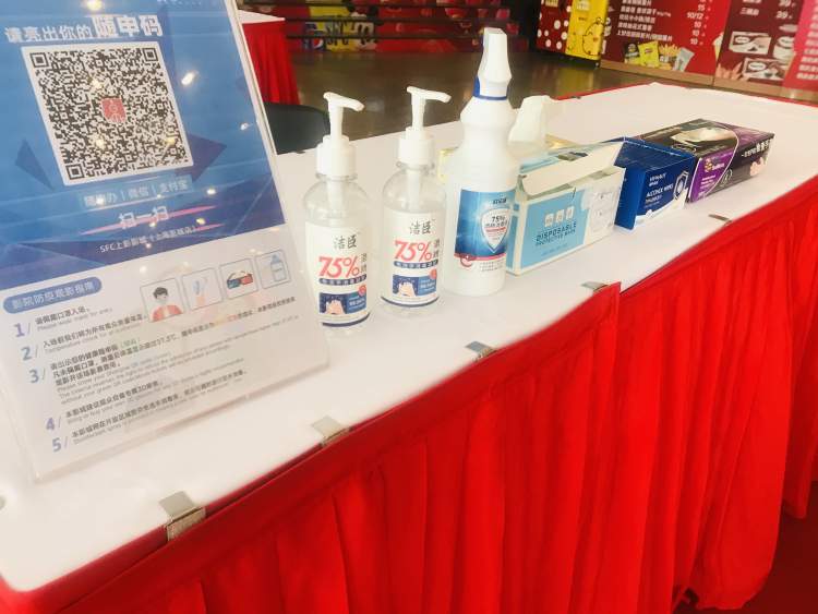 在影院入口设置的桌面上,摆放着两瓶免洗手消毒凝胶,一瓶75%消毒酒精,一盒口罩,一盒独立包装的消毒湿巾、以及一次性检查手套和纸抽。有需要的观众可以自行使用。