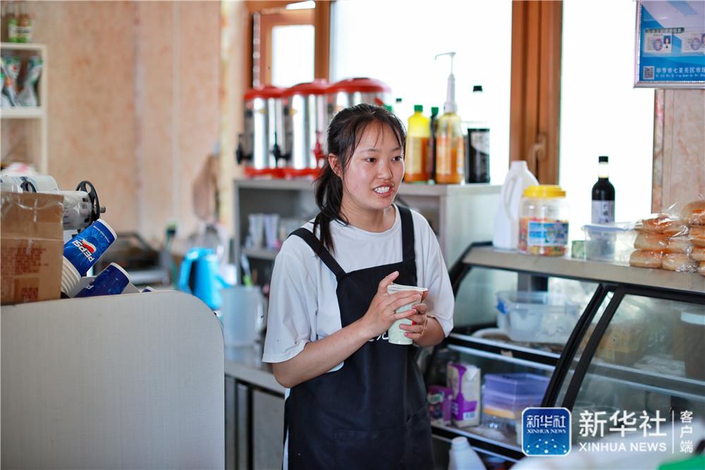 ↑刘林在柏杨林易地扶贫搬迁安置点的一家奶茶店打工,她一个月可以挣2000多元(8月3日摄)。刘续 摄