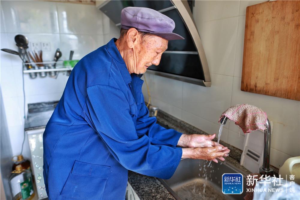 ↑石连英在柏杨林易地扶贫搬迁安置点家中洗手(8月3日摄)。刘续 摄