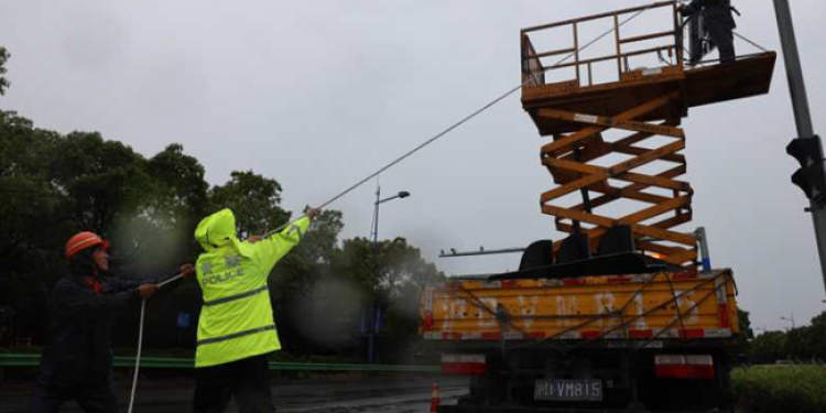 ▲上午9时,浦东新区江山路同顺大道路口,坚持了一晚的路口信号灯终于抵挡不住台风风力被吹歪,交警支队民警陈佶发现异常后立即赶到现场,现场指挥疏导交通,并和维修人员一起开展抢修工作。