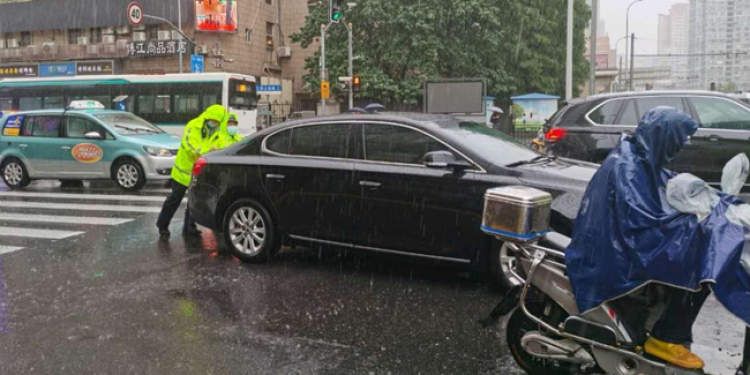 ▲今早,一辆黑色轿车在西藏南路斜土路路口抛锚,民警孙嘉文帮忙推车,确保道路畅通。