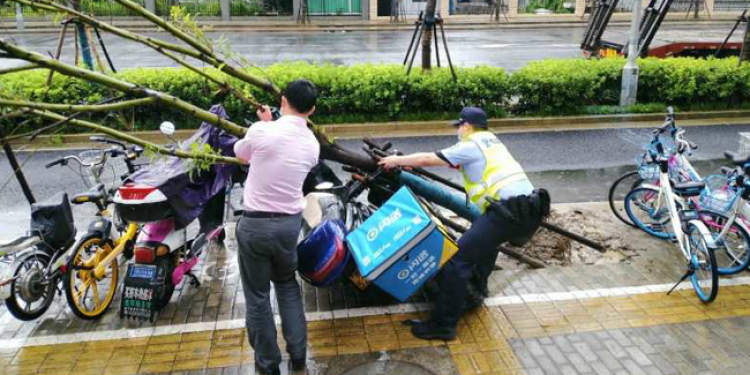 ▲9时30分,轨道交通13号线莲溪路站民警叶波和站长处理出站口被台风吹倒的树木。