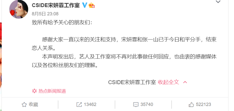 不知道是不是因为这个原因,宋妍霏工作室随即就发了“分手声明”,和张一山撇清关系。