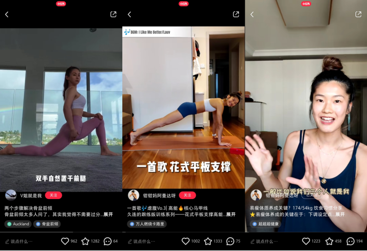 “V姐就是我”和“钳钳妈阿曼达呀”均在几个月内均迅速涨粉几十万。“钳钳妈阿曼达呀”是位年轻母亲,照顾孩子的空闲时间在线上发布健身教学视频。“V姐就是我”年过四十,维持着12%的体脂率,马甲线清晰。