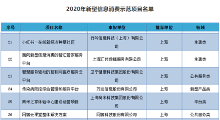 按照《关于组织开展2020年新型信息消费示范项目申报工作的通知》(工信厅信发函〔2020〕56号)要求,此次公示的100个2020年新型信息消费示范项目经企业申报、地方推荐、形式审查和专家评审等环节重重筛选。此番入选的上海企业除汇付天下外,还有小红书、卫宁健康、万达信息、网宿科技等。