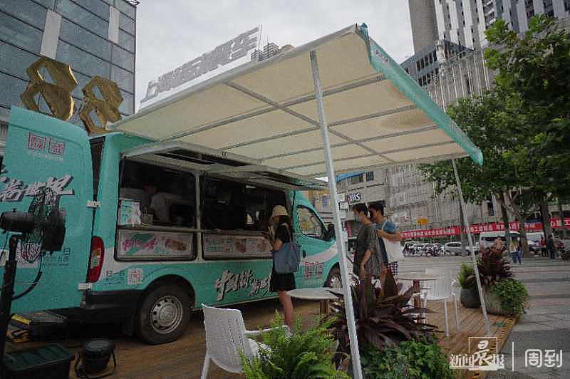 长宁区的KiNG88外广场近期有了一些新变化——隔着马路就能看到一辆醒目的蓝绿色餐车停在外广场上。餐车外设置了遮阳棚,一旁还有两套桌椅可供用餐时使用。