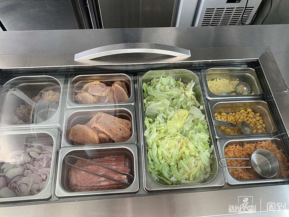据工作人员介绍,这一自带透明玻璃盖的冰箱是他们为了餐车专门定制的,主要是考虑到菜品冷藏的需求之余,也方便消费者更好地挑选。而每天所需的食材全部都由企业的中央厨房集中生产,再由专门的冷链统一配送至相应点位,一部分置于餐车内,另一小部分“备货”则被安放在KiNG88广场2楼的临时小仓库内以便随时取用。