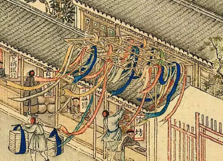 玩过游戏再看《姑苏繁华图卷》,颇有“似曾相识”之感。在布匹店,晾晒的染色布匹迎风飘扬。