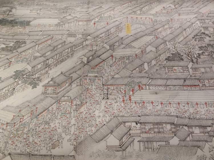 图卷呈现的是苏州最为繁华之地——阊门内外。画中商肆密集,人头攒动,据统计,画中有各色人物1.2万余人,各类房屋建筑2140余栋,商号招牌200余块,涵盖了50多个手工行业,较《南都繁会景物图》上了一个台阶,更是《清明上河图》长度的两倍。