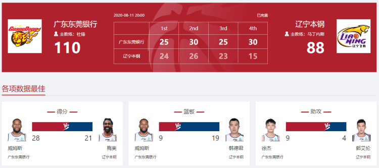 末节争夺,辽宁连续进攻不中,梅奥没能延续上半场的得分火力,还吃到第5次个人犯规。广东外援威姆斯在本节爆发,依靠个人能力连续冲击辽宁内线,易建联也通过补篮拿下打破得分荒,广东顺势建立起两位数领先。辽宁暂停调整依然无法解决进攻端问题,最终,广东110比88大胜辽宁。