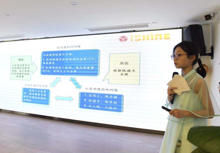 康煦宁同学用视频展示了他的调研结果和建议。康煦宁深度调研了小区快递不便的问题,并采访了小区小卖部代收快递的店主爷爷、快递员和其他小区居民,得出结论:需要安装快递收件柜,同时建议将原来的垃圾回收站改造为收件柜,以最低的成本解决小区快件不便问题。