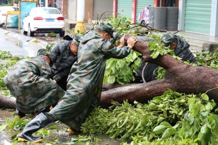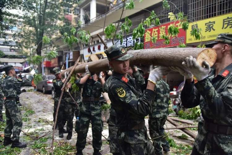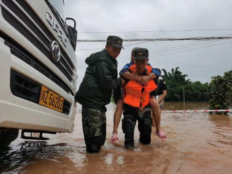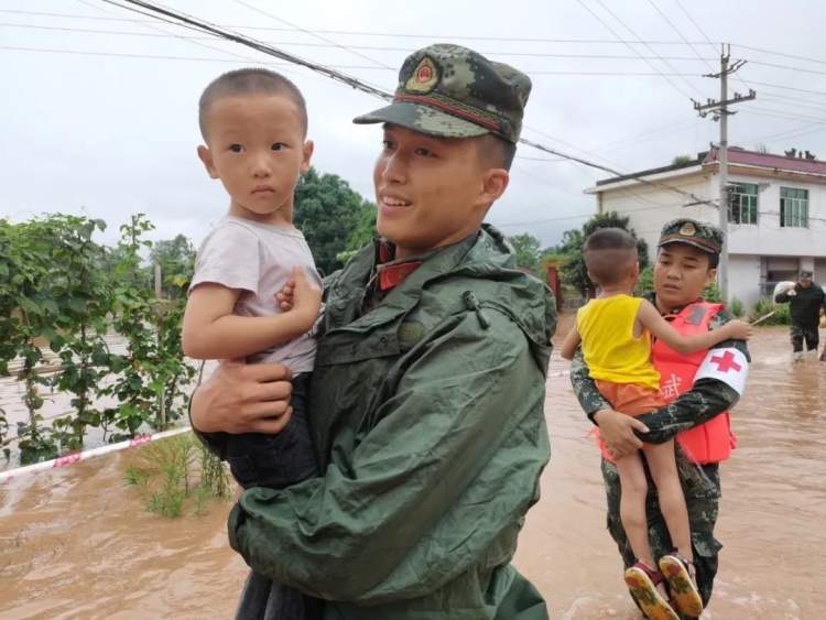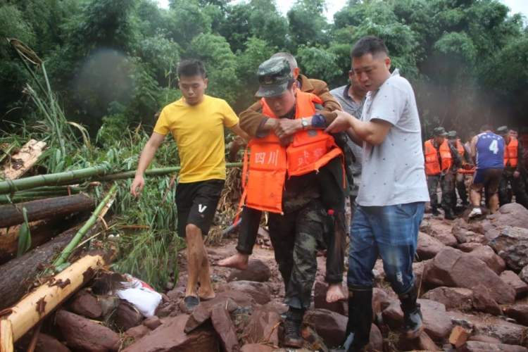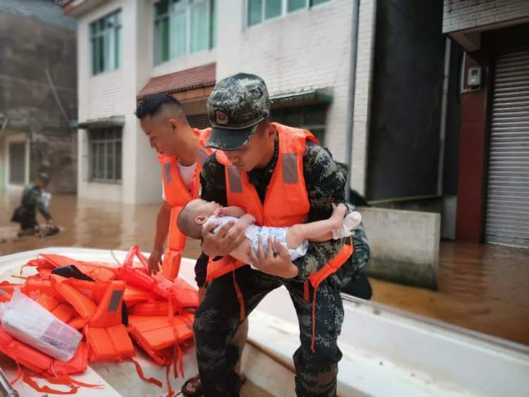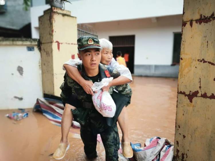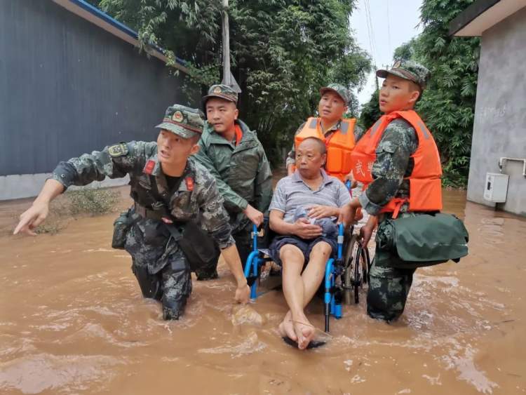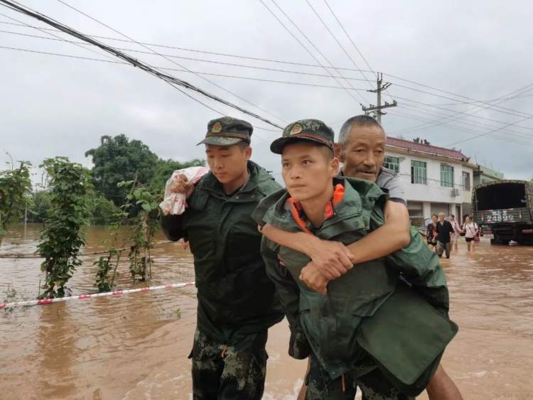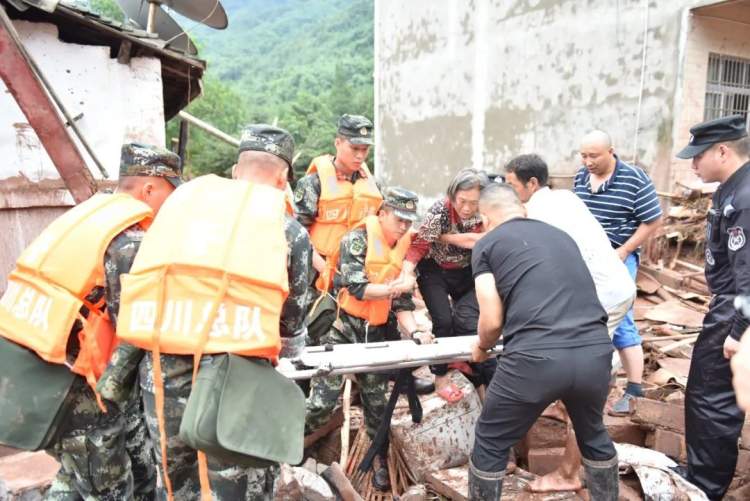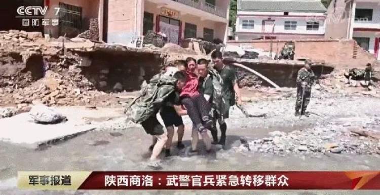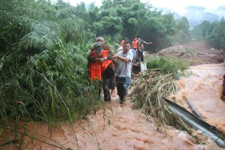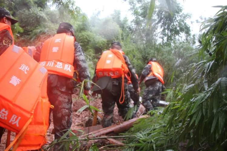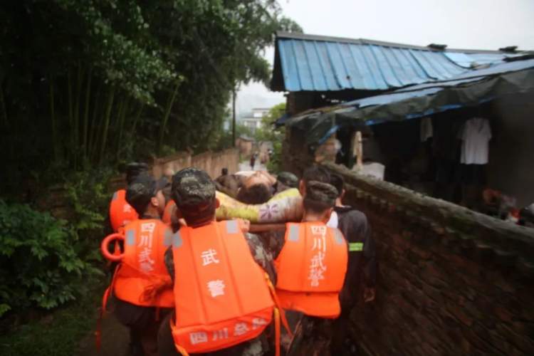 武警雅安支队官兵在雅安市雨城区八步镇八步村转移搜救被困群众