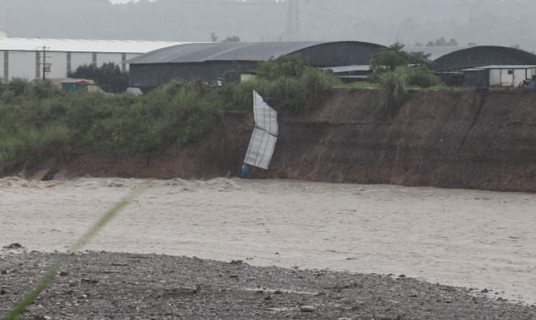 汹涌的洪水不断冲刷堤岸和新勘堰