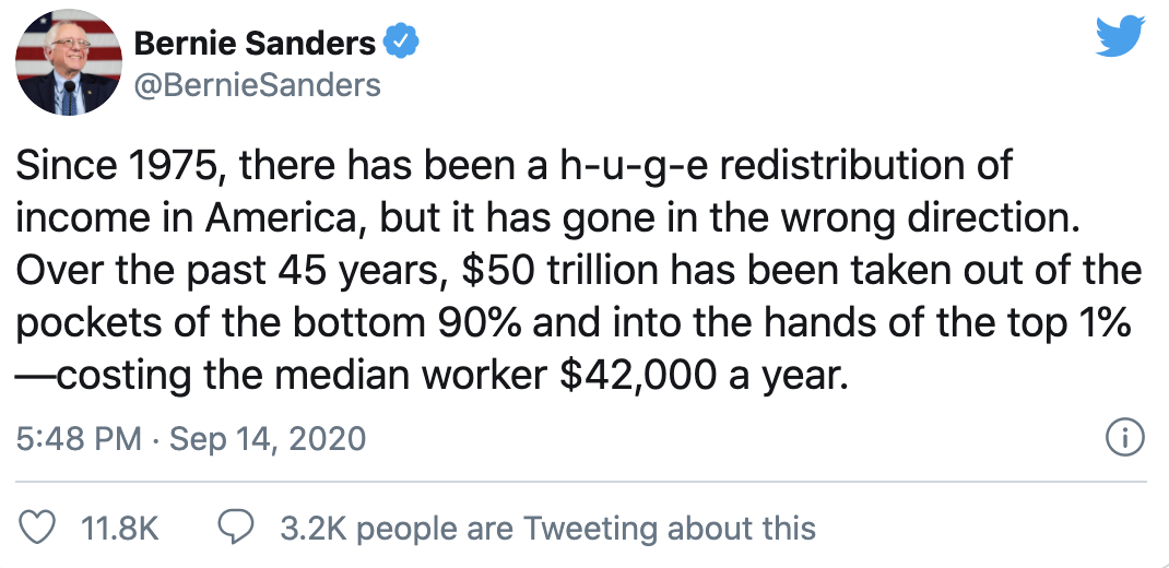 美国民主党参议员桑德斯阅读兰德公司报告后发推,对美国财富分配的不公进行抨击。桑德斯写道:“1975年以来,美国社会对收入进行了大规模的重新分配,但其方向完全是错误的。 过去45年中,最底层的90%民众掏出了50万亿美元,而最富有的的1%却却拿走了50万亿美元,这使中位数的工人每年付出了42000美元。”
