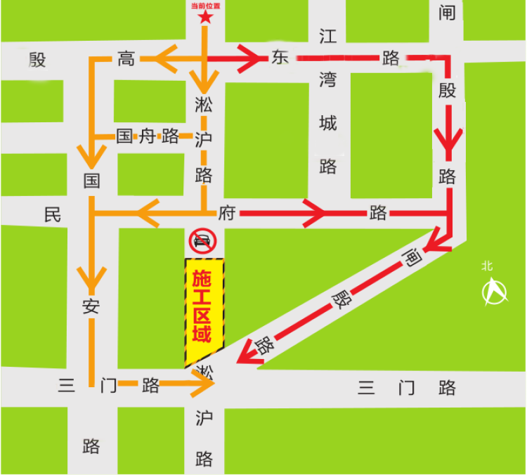 路径1:淞沪路-民府路(殷高东路、国舟路)-国安路-三门路-淞沪路进行绕行。