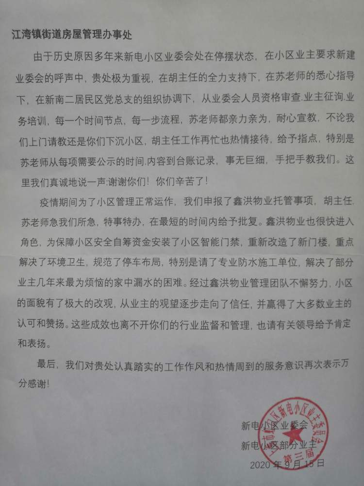 与此同时,新电小区业委会还给房管办送来了一封感谢信,上面密密麻麻的文字表达了他们对房管办工作人员浓浓的感激之情,一位小区业主代表脸上洋溢着笑容:“住在小区里,图的就是安定,幸好有你们啊!”