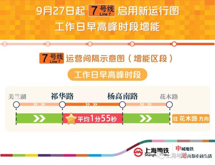 9月27日起,上海地铁7号线将启用新图,工作日早高峰增投4列列车,祁华路站往杨高南路站方向的列车运行间隔缩短至1分55秒。7号线成为继9号线后第二条列车最短运行间隔跑进2分大关的线路。