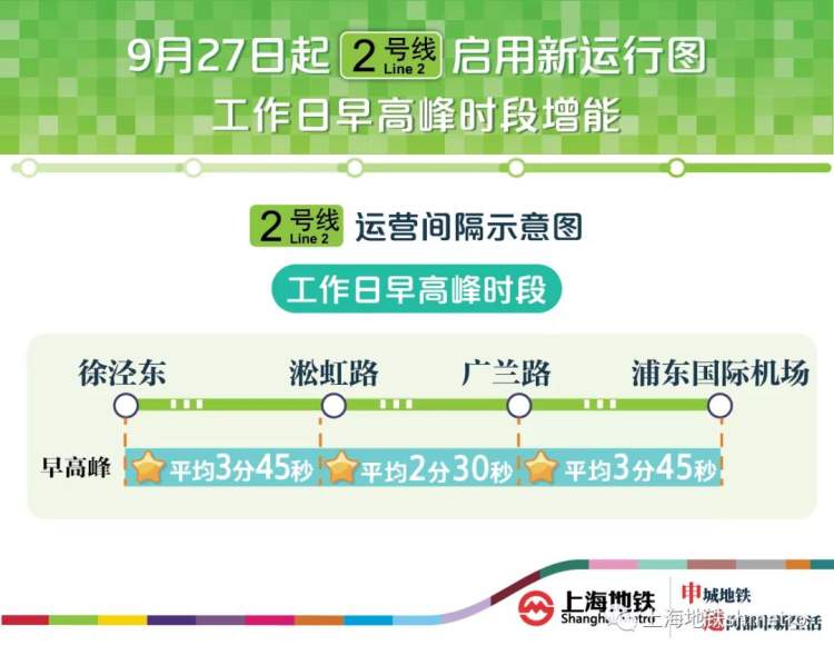 9月27日起,2号线也将启用新图,在工作日早高峰时段增投8列车:徐泾东站——广兰路站双向列车运行间隔由平均2分钟40秒缩短至平均2分30秒。徐泾东站——淞虹路站及广兰路站——浦东国际机场路站双向列车运行间隔均由平均4分缩短至平均3分45秒。