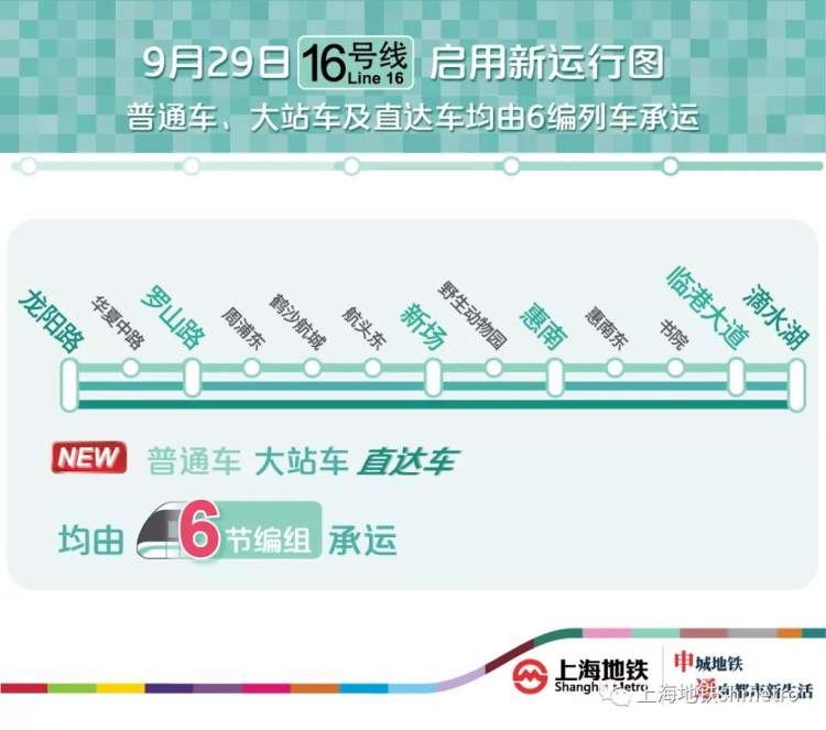 此外,有利于进一步缓解16号线客流压力,为上海自贸区临港新片区提供更好的交通服务,9月29日起,16号线将再次启用新图,届时16号线将全部由6节编组列车载客运营。