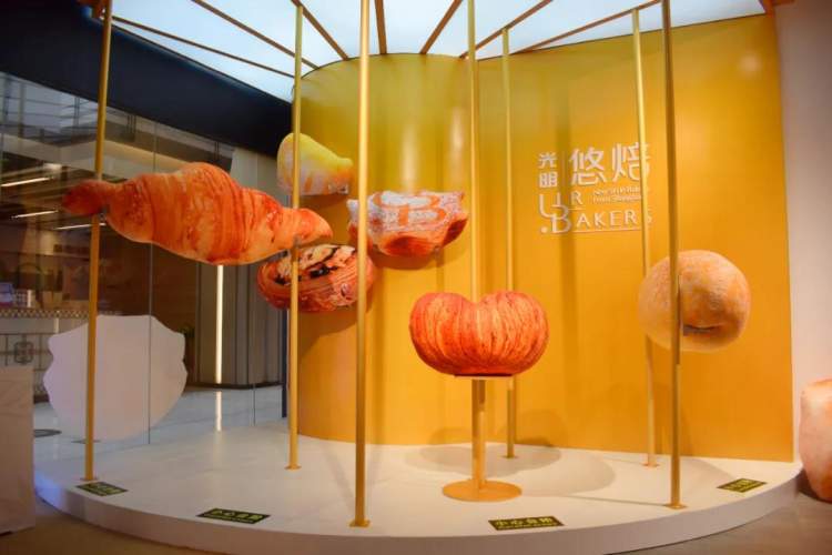 “光明悠焙快闪店”就开在南京东路139号,店里除了有存放了西点烘焙原料的透明胶囊,还有模拟了真实工匠风的标志性窑炉~在店内的另外一角,鲜奶吐司、大号蝴蝶酥和羊角包还组成了趣味十足的“旋转木马”,在南京路上也能体验一把“少女心”啦~