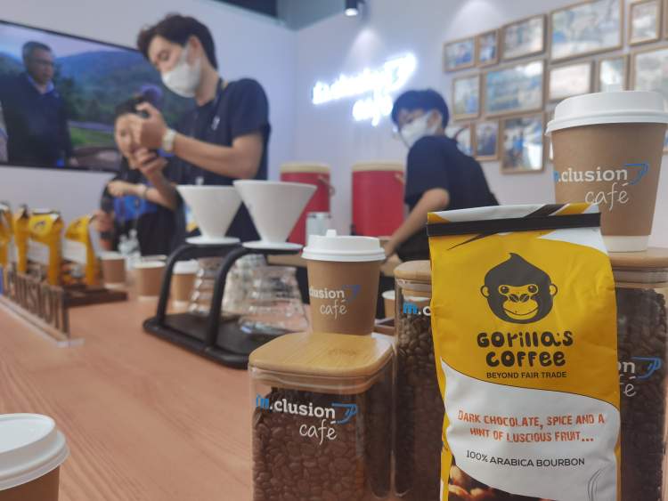 9月24日外滩大会主论坛外,飘出阵阵咖啡的香味,一群嘉宾正排着队,等着一杯来自非洲卢旺达的大猩猩咖啡。