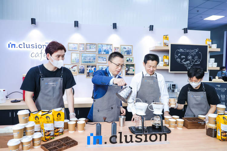 实际上,在主论坛开始之前,蚂蚁集团董事长井贤栋就在会场外变身了咖啡店服务员,他围着围裙,边问咖啡小哥,边学冲泡现磨咖啡,为现场的嘉宾服务了一把,甚至直接为咖啡“带货”。