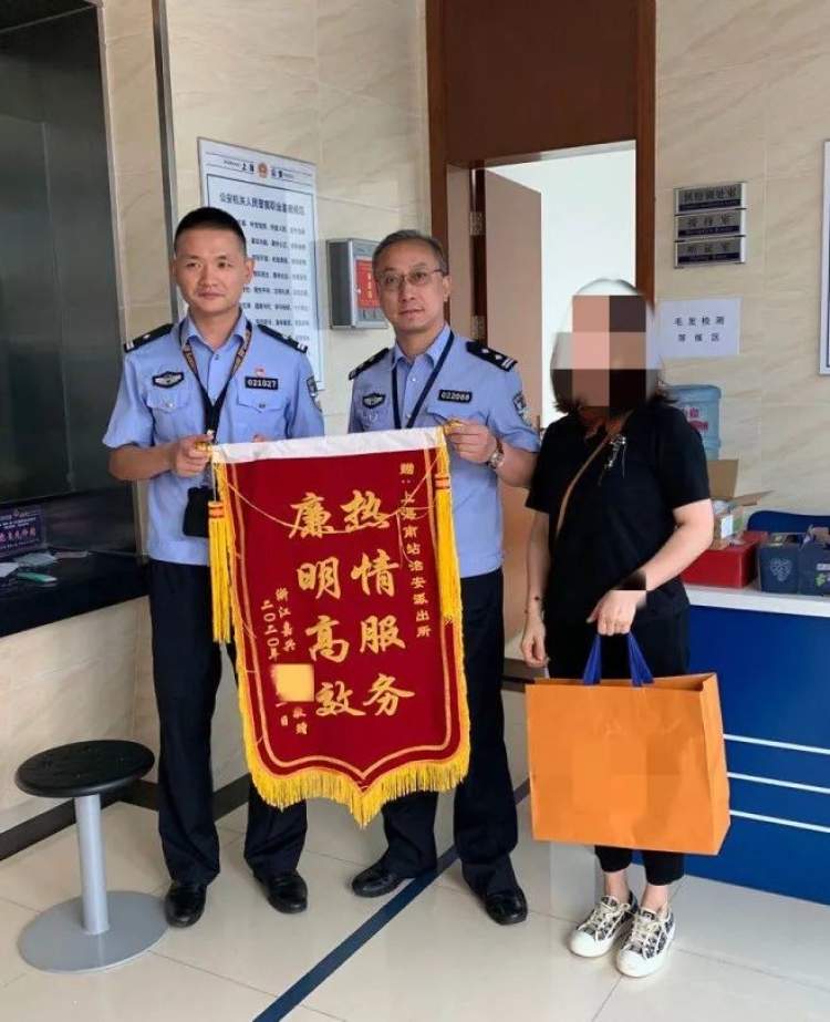事发第三日,失主沈女士再次来到派出所,在取回手提包的同时,她向当事民警沈俊、李传梅赠送了一面印有“热情服务 廉明高效”的锦旗。