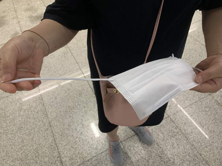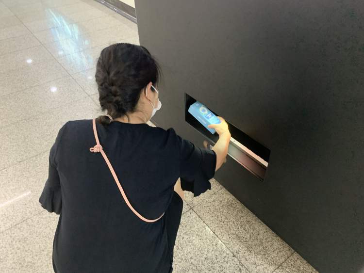 售卖机前,口罩碰巧损坏的陆女士正在购买口罩。她表示,自己的口罩在站内损坏,得知今日售卖机可以直接购买口罩,便来试试。陆女士告诉周到君:“2元一只的价格相比外面有些偏贵,但买3只来应急的话还是可以接受的。”