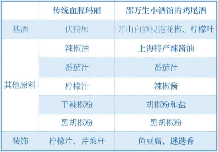 ■为了更加直观地感受到邵万生小酒馆的鸡尾酒有多么接地气,周到君做了张与传统血腥玛丽的用料对比图。感受一下调酒师的脑洞~
