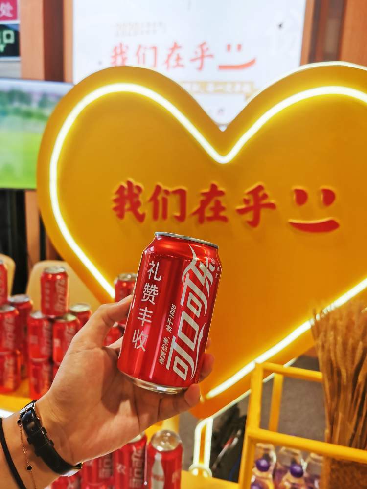 直播间中,罗列着一排排定制可口可乐、纯悦水的展柜吸引了过路人的目光。现场,不只有市民好奇光顾,更有丰收节工作人员、演艺人员来到直播间,在一次次的分享中,让“我们在乎”传播得更广泛。