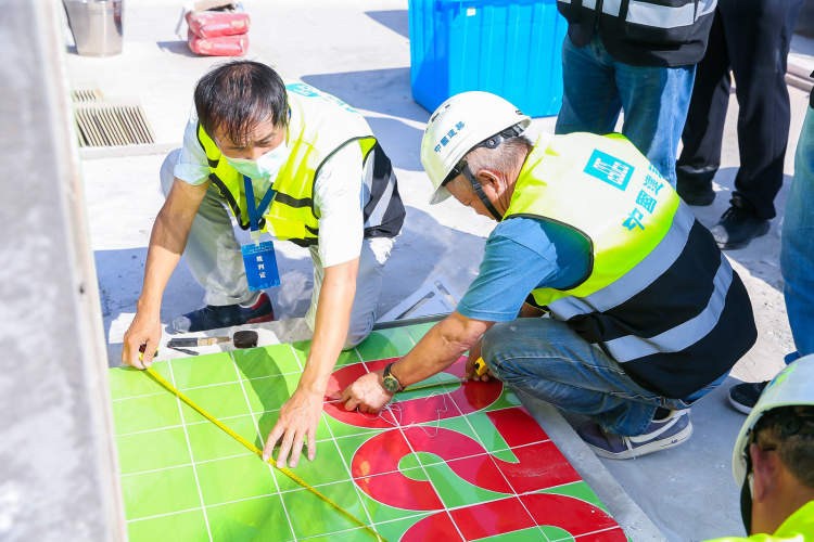 在比赛现场记者看到,参赛选手精神抖擞、争分夺秒地投入到竞赛中。只见他们仔细量好墙面位置,熟练地涂抹平整水泥浆,把绿色和黄色瓷砖铺贴在墙面上;同时小心切割打磨红色瓷砖,将红色瓷砖拼贴出五角星图案和“C”“N”两个英文字母。