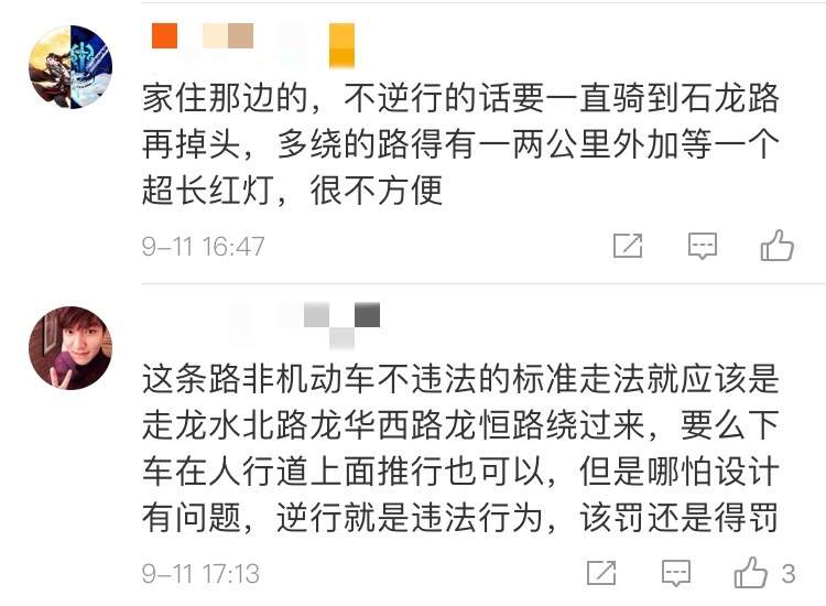 “不逆行的话,要一直骑到石龙路再掉头,多绕的路得有一两公里外加等一个超长红灯,很不方便”