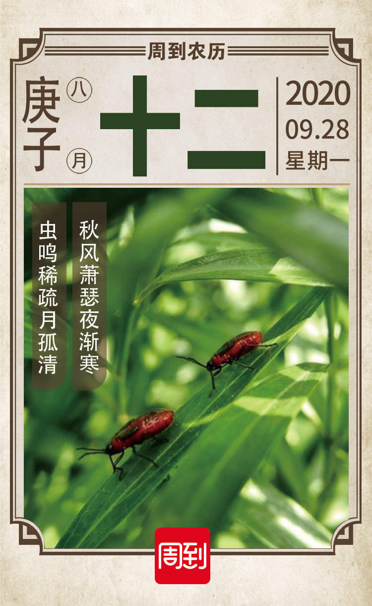 农历中国 | 八月十二 · 蛰虫坯户 额是狼 2020-9-28 来源:周到上海 秋风萧瑟夜渐寒 虫鸣稀疏月孤清 秋分后第六天, 进入到秋分第二候, 蛰虫坯户。 古人有诗曰: “草端无华滋, 阴气已盘固。 忽忽远枝空, 寒虫欲坯户。” 说的便是秋分时节的物候现象。 虫子们感受到了气候的阴冷, 开始忙着寻找暖和的庇护所, 为藏身越冬做准备了。 此后的夜晚, 虫鸣声也渐稀疏。 直到来年春天“惊蛰”时节, 虫子们感地气渐暖而萌动。 来源:周到上海 作者:额是狼 赞一个 (0)