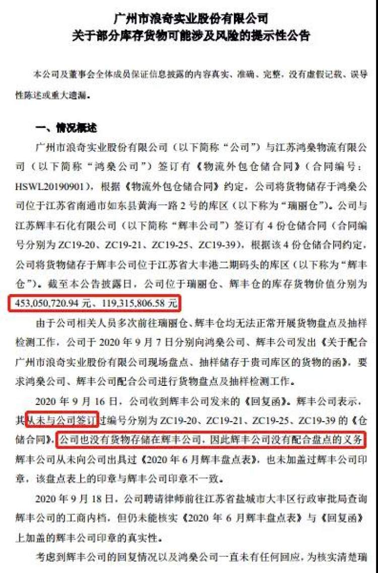9月27日晚间,广州浪奇发布的公告让投资者“炸锅”——公司近四成的存货不见了。公告称,广州浪奇之前跟江苏鸿燊物流有限公司、江苏辉丰石化有限公司两家公司分别签订物流仓储合同,将一批货物储分别储存在瑞丽仓和辉丰仓的仓库中,库存货值分别为4.53亿元、1.19亿元,合计5.72亿元。然而,本月当公司派人去这两个仓库盘点时,上述两家公司说没有存过这批货物,也没有签过储存合同。