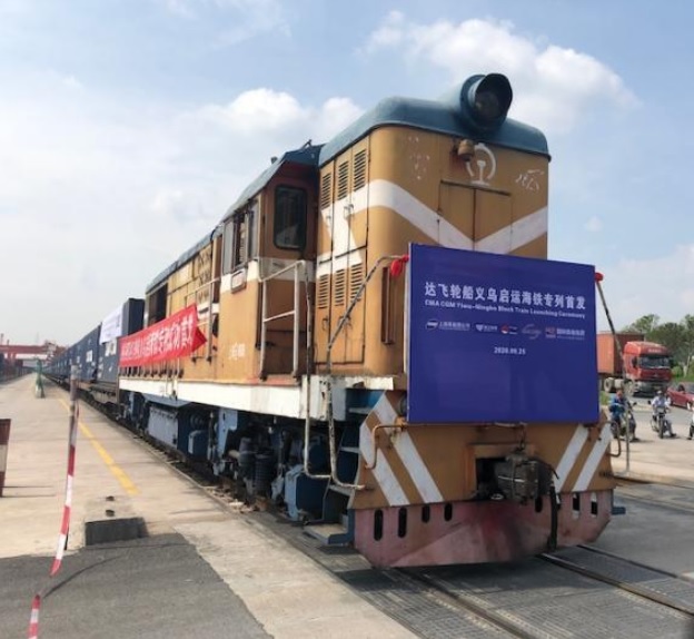 9月25日,义乌—宁波舟山港海铁国际联运“达飞号”专列首发现场。(资料图片)