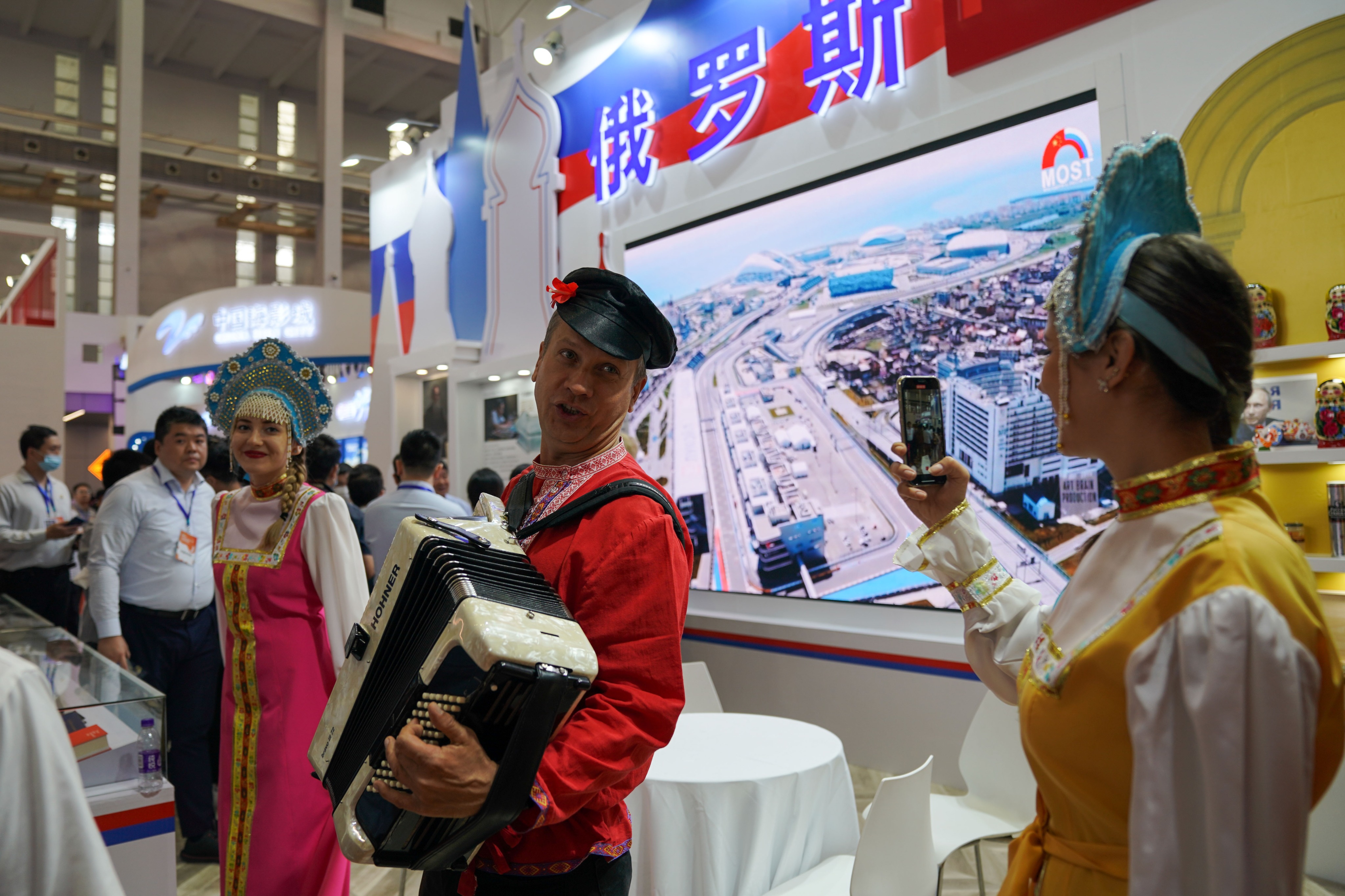 9月25日-27日在宁波举行的2020海丝之路(中国·宁波)文化和旅游博览会上,俄罗斯为展会观众带来民族音乐表演。(殷晓圣 摄)